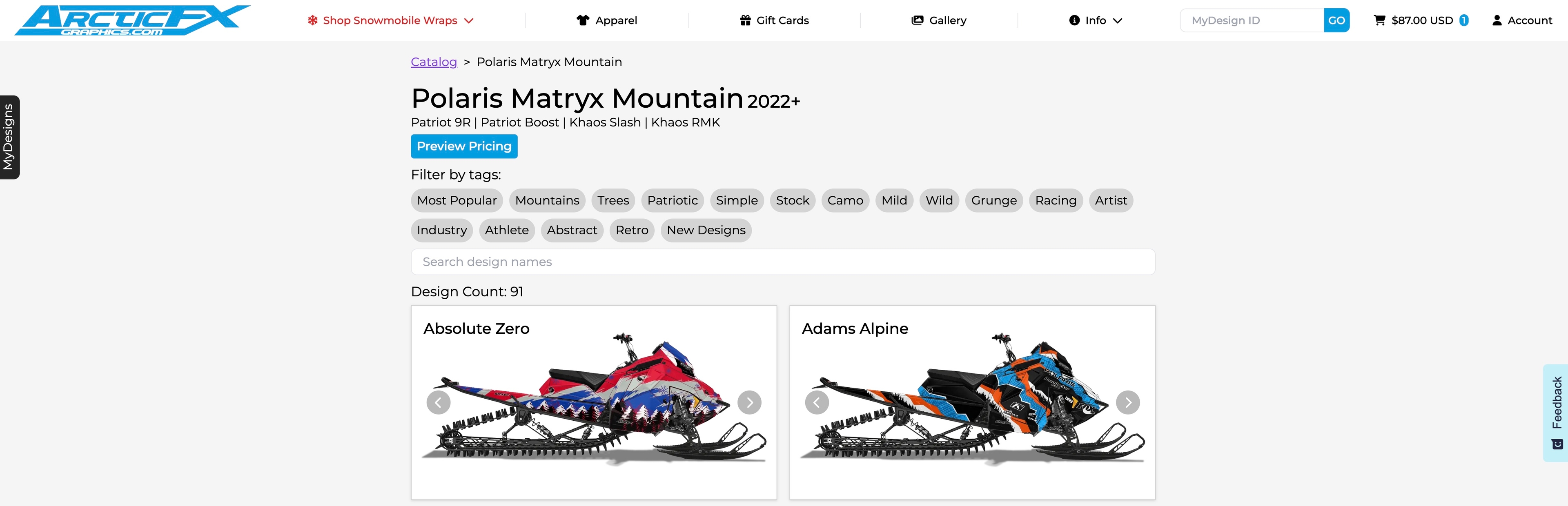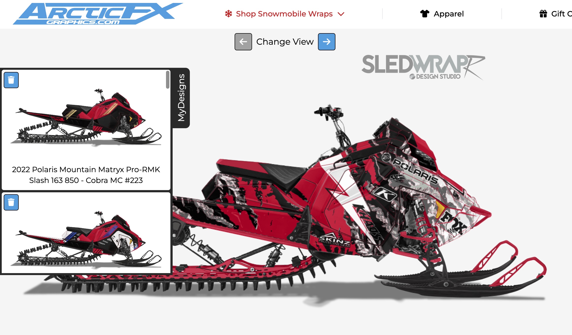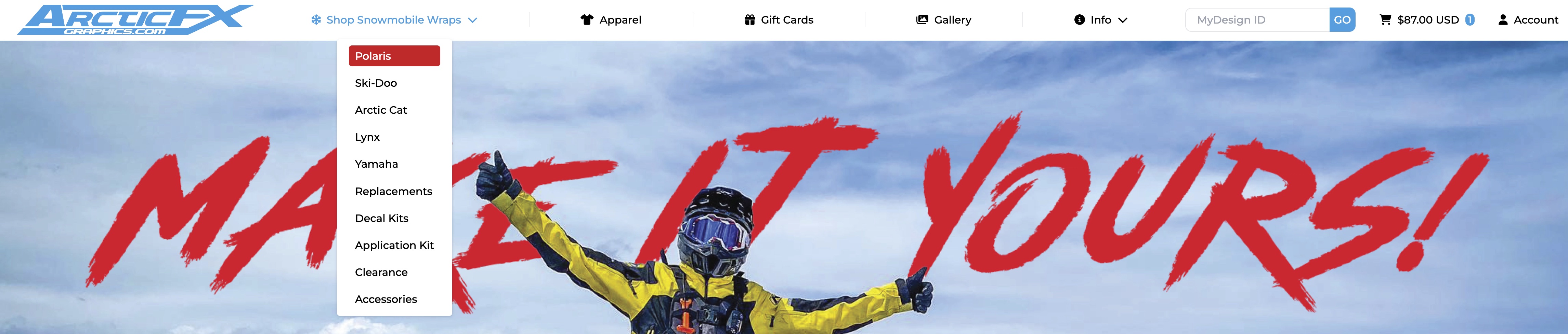 To begin your design journey, head over to the homepage at www.arcticfxgraphics.com. Drop the Shop Snowmobile Wraps menu bar down and click on your manufacturer.