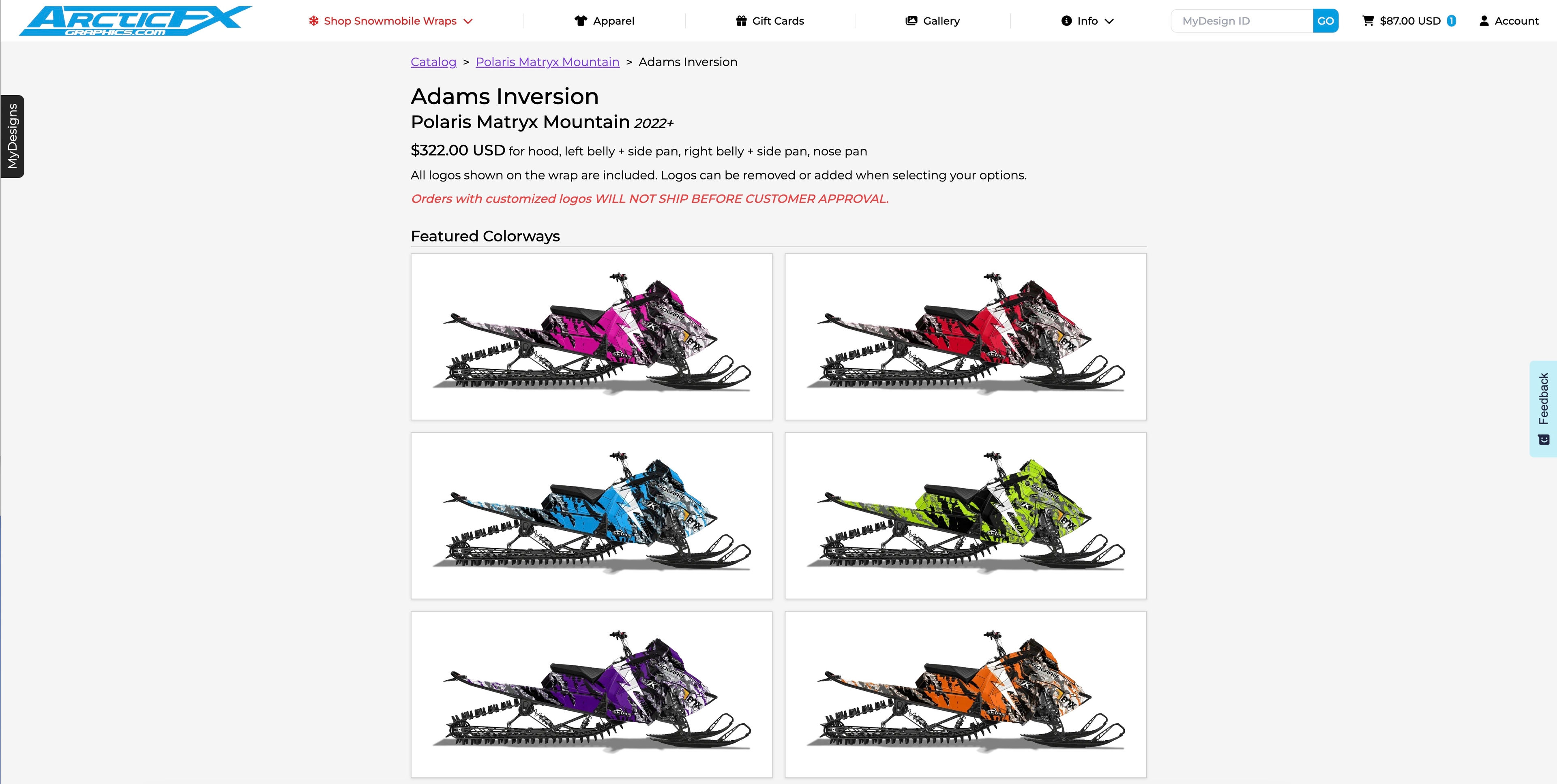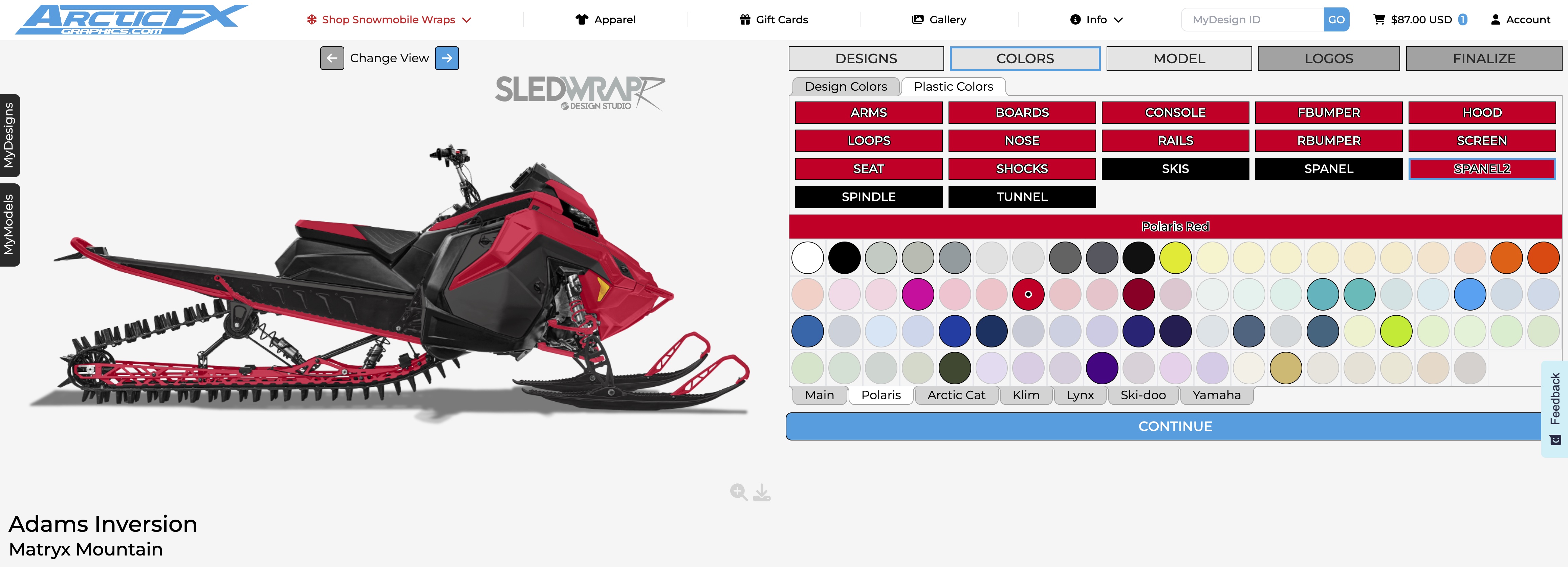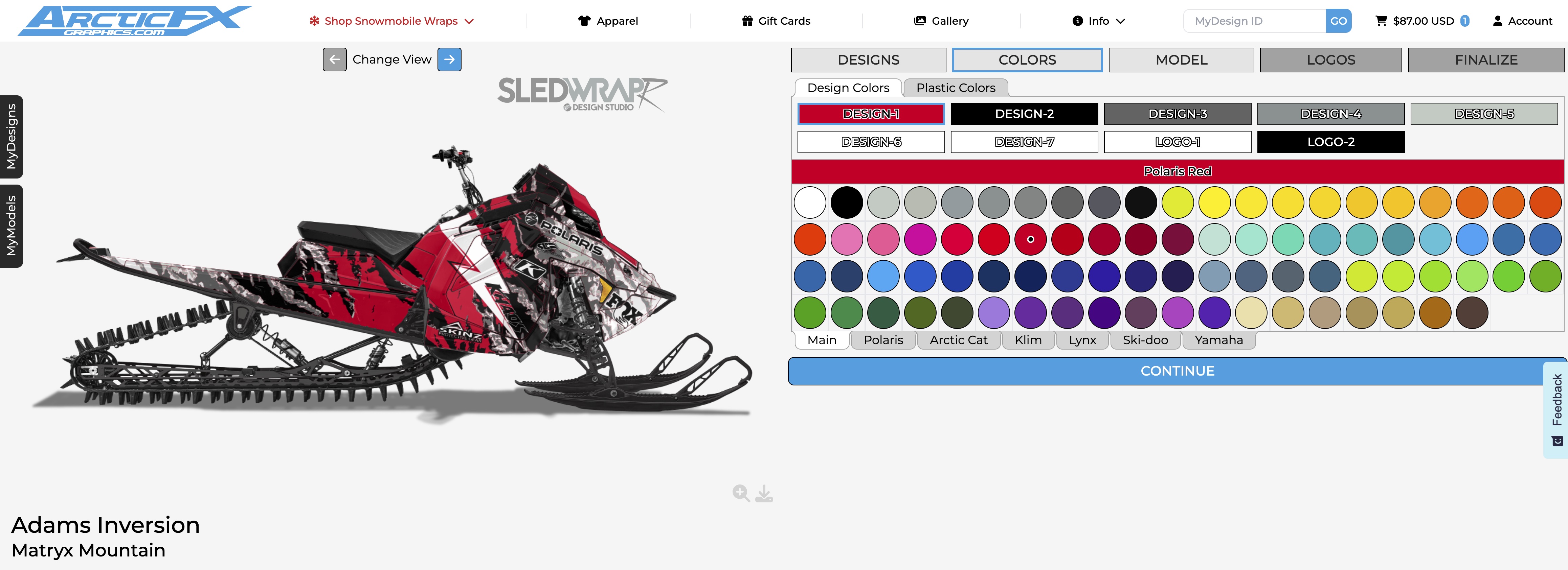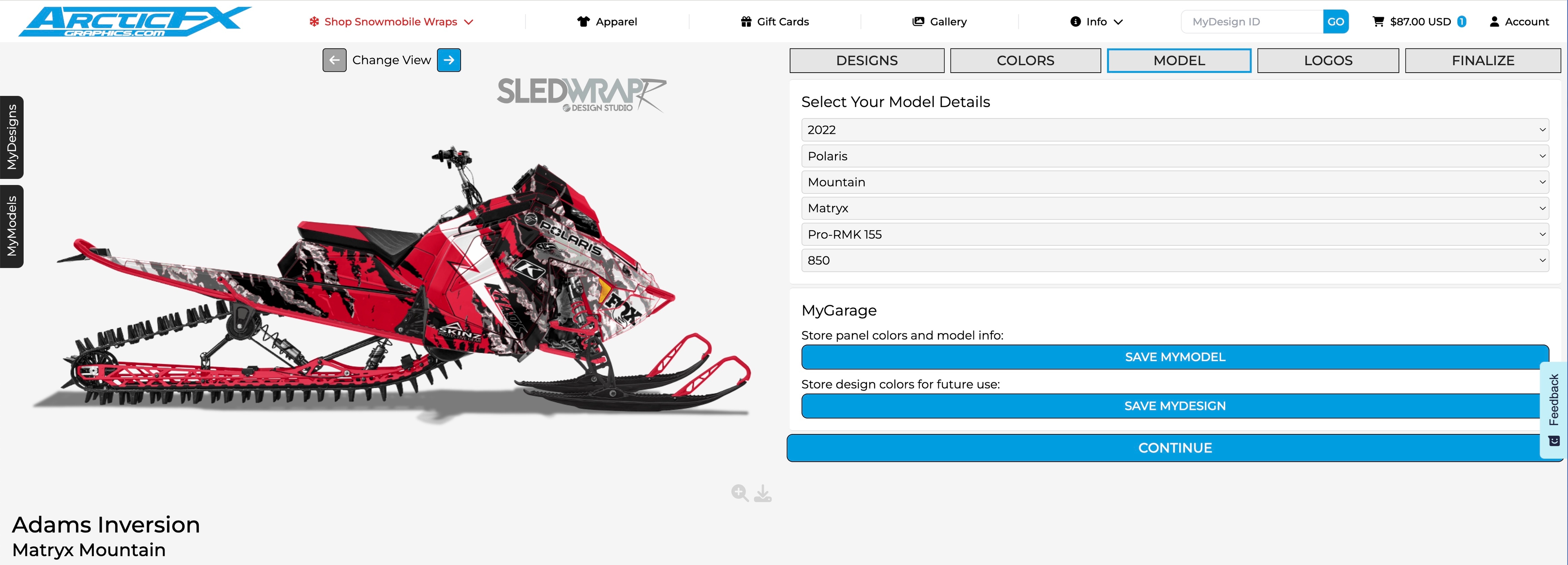 Once your design is to your liking it’s time to let ArcticFX know the exact details of you snowmobile. Click continue to access the Model information. Select your sled’s year, Submodel, track length, and engine size. You can also save your model here so you can come back and design more wraps on your saved plastics colors. Additionally you can save your design if you want to share it with your crew before you buy!