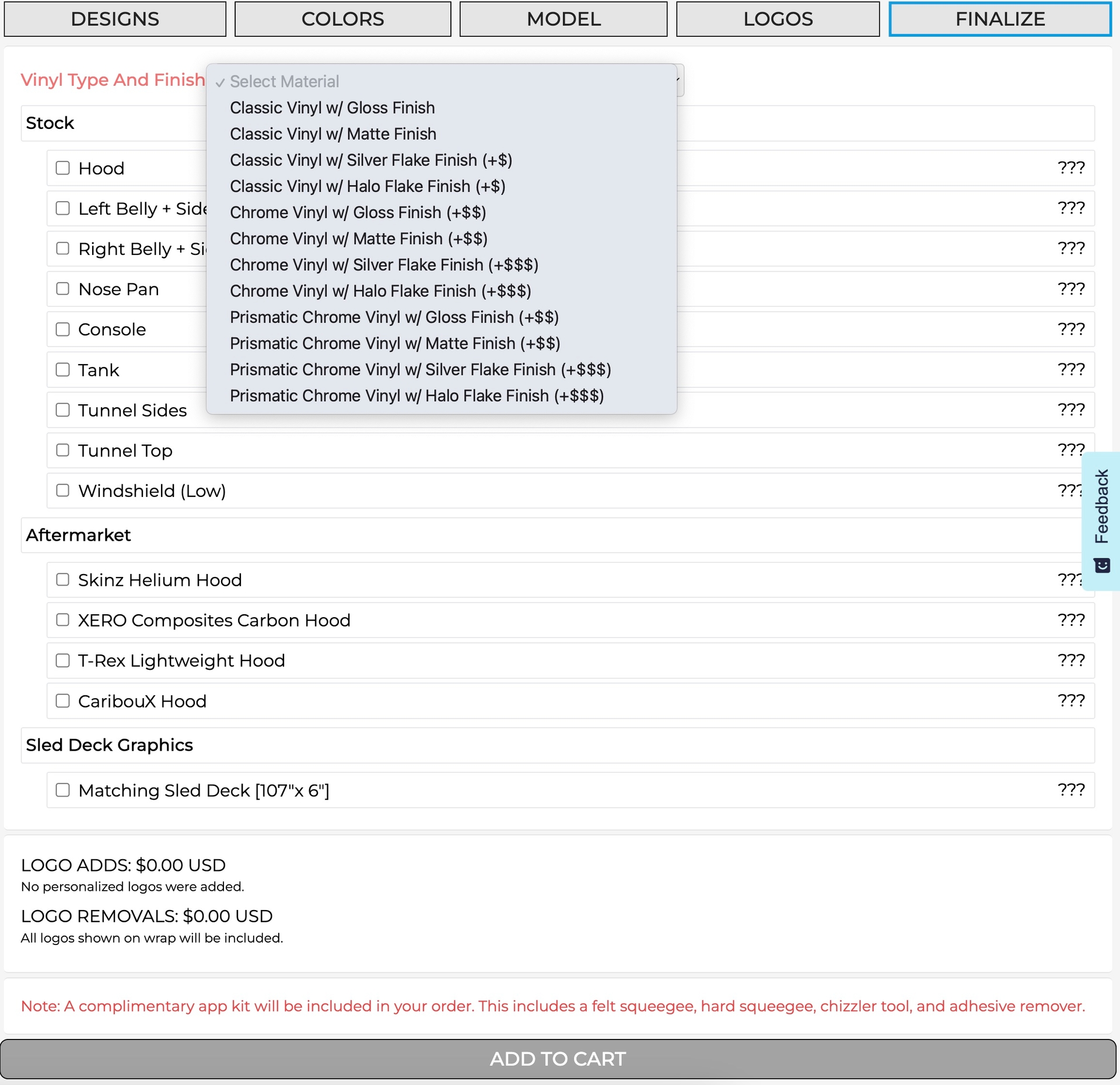 Once you’re satisfied with your custom wrap, it’s time to finalize your design by adding logos. ArcticFX does this through the Logos tab. Simply type in what logos you’d like to add in the spaces provided. Theres no need to upload anything as ArcticFX has one of the largest libraries of aftermarket and OEM logos in existence. Once your order is placed a designer will email you a proof with the logos added and you can make any changes you like from there! Don’t worry, nothing will go to production without your approval!